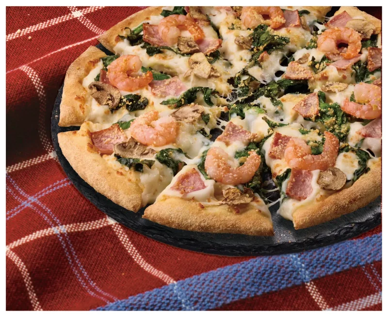 ほうれん草、ハム、えび、マッシュルーム、パルメザンミックス、ホワイトソース