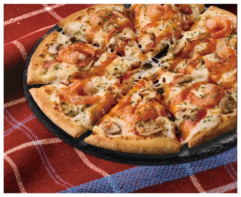 一枚で2つの味が楽しめるハーフ&ハーフ仕様になっており、「ぷりっと海老のチーズグラタン」と「ぷりっと海老のビスクソース仕立て」を同時に味わえるのが最大の魅力となっています。